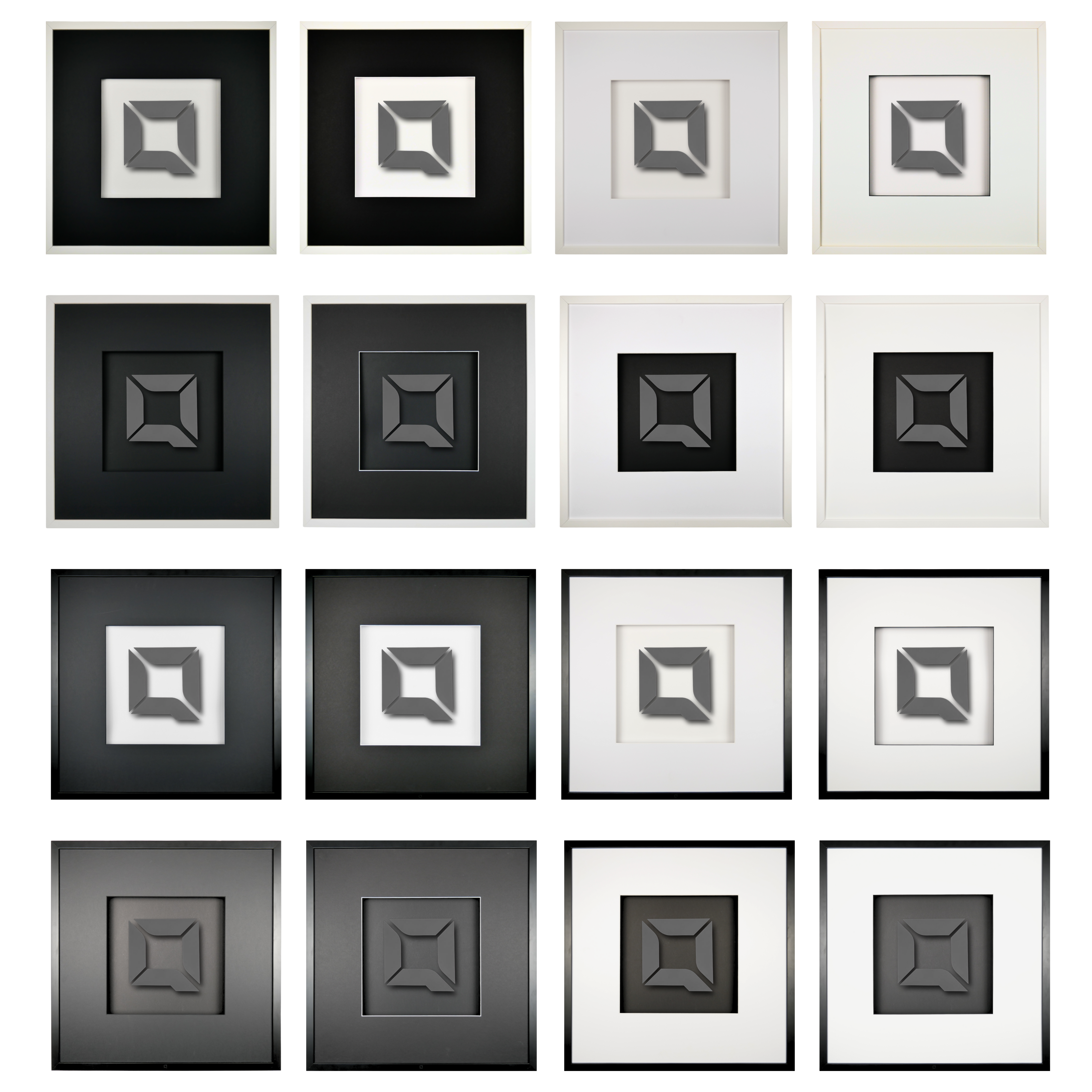 All square works consist of high-quality wooden frames, painted black or white with a semi-matte finish.